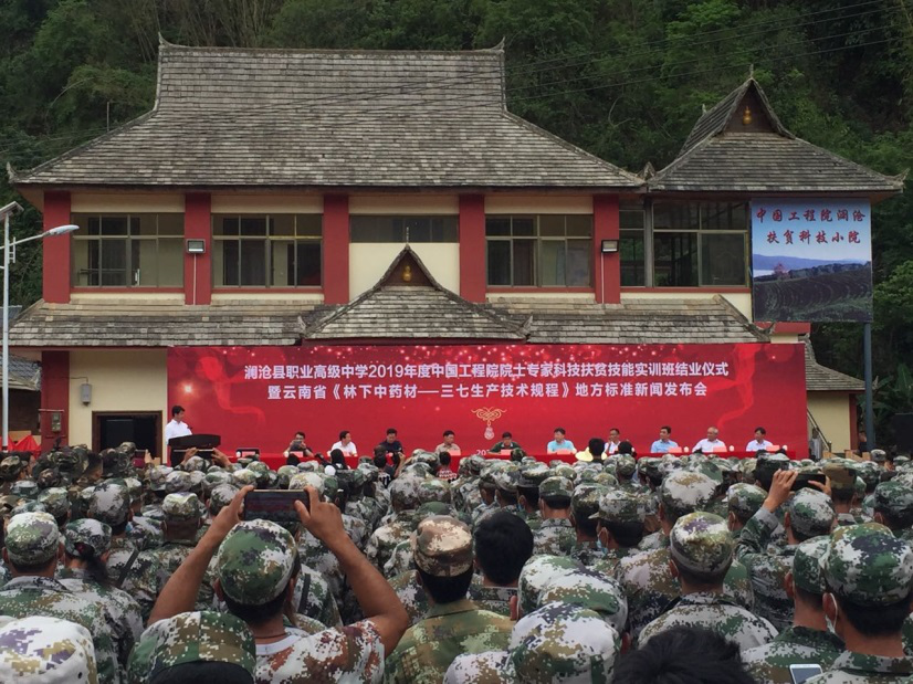 6月11日下午,调研组来到中国工程院建立在澜沧县竹塘乡蒿枝坝村的院士专家小院,参加由时代楷模、中国工程院院士、云南农业大学名誉校长朱有勇率领专家教授团队牵头完成的云南省《林下中药材——三七生产技术规程》地方标准在发布会。中国工程院党组书记、院长李晓红,中国工程院副院长邓秀新,朱有勇院士出席发布会。调研组在发布会现场见证了脱贫攻坚实用技术院士专家指导班10个班级500多位澜沧各乡镇农民学员的结业仪式。中国工程院朱有勇院士的专家小院,是全国农业教指委认定的高原特色农业科技小院依托单位,教育部副部长翁铁慧2019年5月24日为云南农业大学农业专业学位人才培养基地授牌。