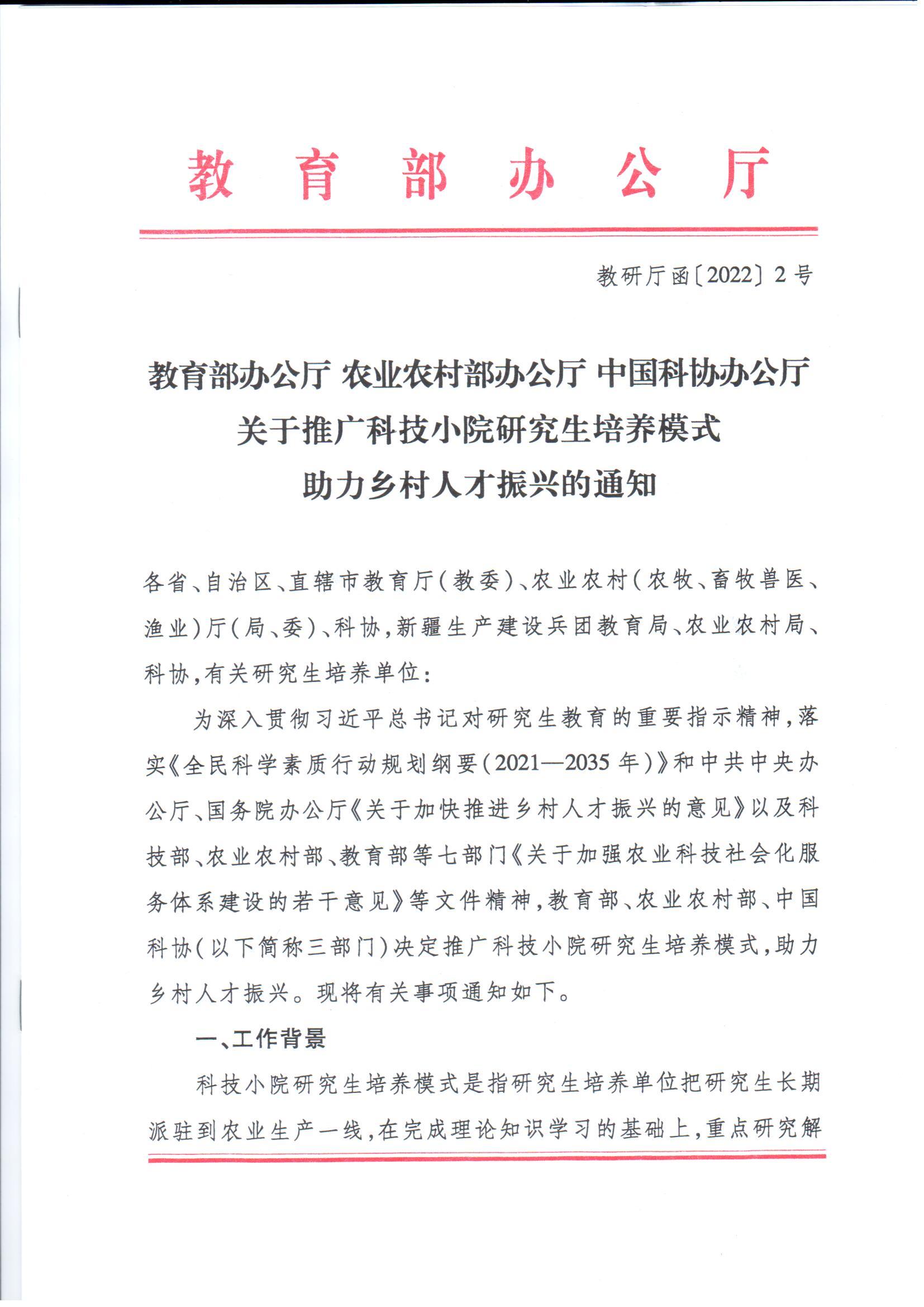 【转发通知】关于推广助力科技小院研究生培养模式助力乡村人才振兴的通知