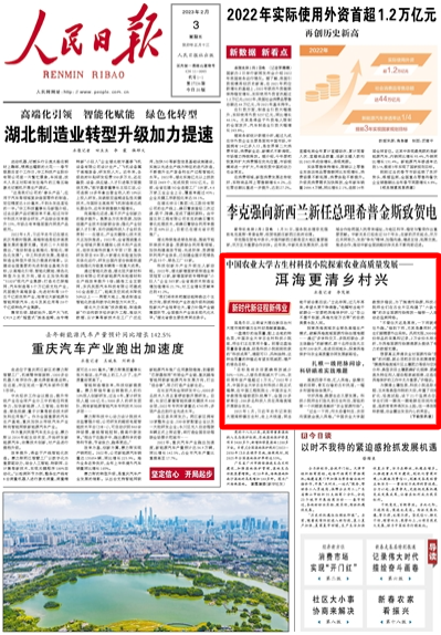 编者按:2月3日,《人民日报》在头版以《中国农业大学古生村科技小院探索农业高质量发展——洱海更清乡村兴》为题,报道中国工程院院士、中国农业大学资源与环境学院教授张福锁带领团队扎根云南省大理市洱海边的古生村,探索洱海保护与农业高质量协同发展新路径,助力乡村振兴的故事。本篇报道由学校党委宣传部、资环学院和人民日报社共同策划,是学校关于“洱海科技大会战”系列报道的其中一篇。