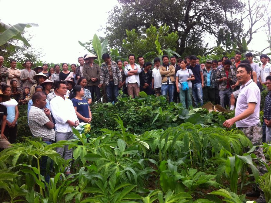 对临沧市耿马傣族佤族自治县的户肯,四排山,老上寨,双四路边,贺派,芒右,崩弄,耿马镇,弄巴,石灰窑,新华,南木弄,勐简、吃水岗,芒洪,科且以及孟定尖山、色树坝、大水井、山头寨等地进行深入调研。在了解当地农业种植现状,分析当地的气候条件和水热条件的基础上,推荐孟定镇尖山村村民先用一部分土地种植珠芽魔芋,在耿马县孟定镇产业办的协调下,与对接企业临沧滇晟农林发展有限公司一起,将珠芽魔芋种球发放给建档立卡贫困户种植,每户发放400kg珠芽魔芋种球,种植1亩。