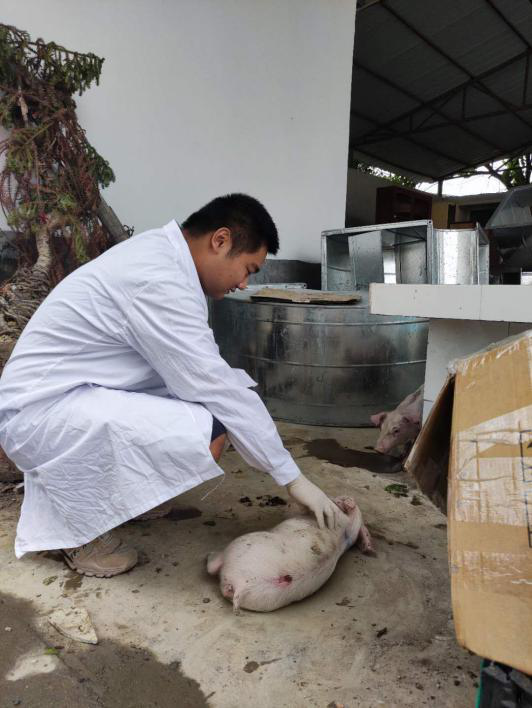 动物科学学院(蜂学学院)兽医硕士郑灿阳在龙岩学院兽医研究所检查送检病猪精神状况