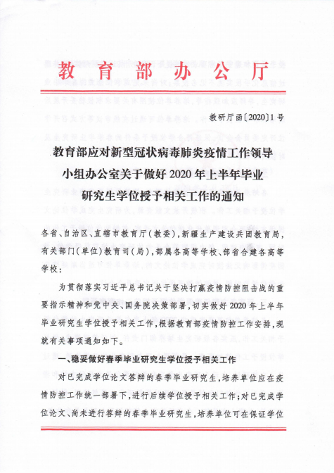 近日,教育部应对新型冠状病毒肺炎疫情工作领导小组办公室印发关于做好2020年上半年毕业研究生学位授予相关工作的通知,请各地各研究生培养单位稳妥做好春季毕业研究生学位授予工作,系统谋划夏季毕业研究生学位授予工作,压实各方责任确保学位授予相关工作有序开展。 通知要求,各研究生培养单位要高度重视,创新管理模式,做好学位授予工作精细预案。导师要加强与研究生的日常沟通,主动为研究生学习和撰写学位论文提供支持和指导。学生工作部门和辅导员要及时掌握研究生思想状况,做好心理疏导,加强人文关怀。各省级教育主管部门要加强指导和监督,最大程度降低疫情对研究生毕业、深造、就业造成的影响。