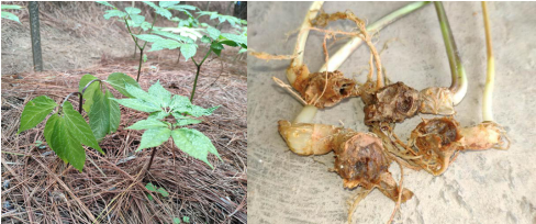 根腐病地上部分症状(左图)和根部腐烂(右图)